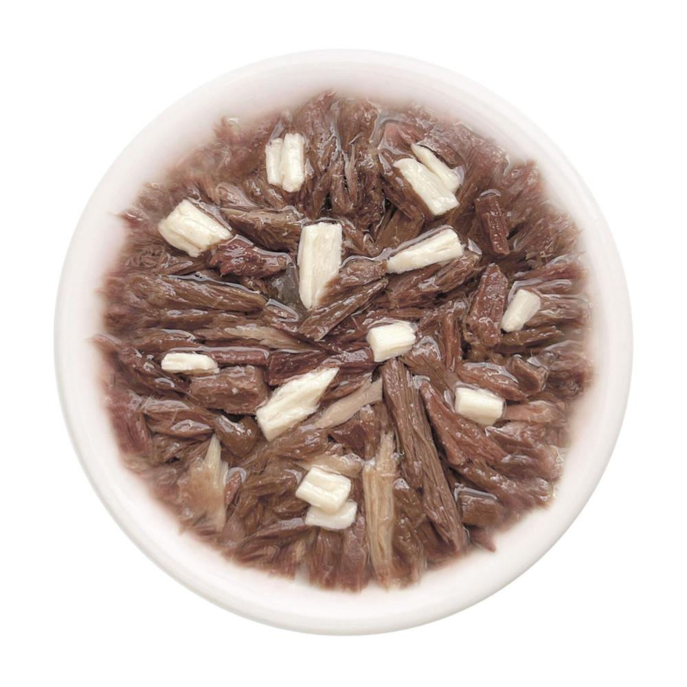 A diferencia de un paté uniforme, este alimento presenta una textura muy natural y apetitosa: consiste en carne desmenuzada y fibrosa de atún rojo mezclada con pequeños cuadritos sólidos de pollo, todo bañado en un caldo muy ligero y sabroso.