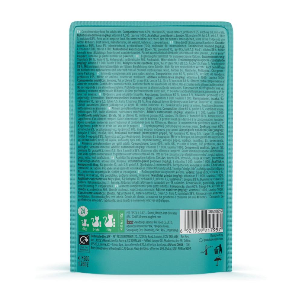 | Presentación | Pouch / Empaque de 50 g (Meal Nro 3 Tuna & Chicken) |