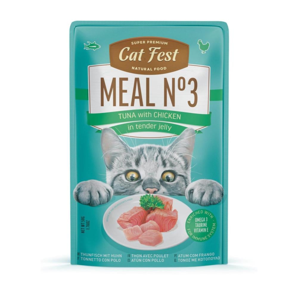 Cat Fest Meal Nro 3 Tuna & Chicken es un alimento húmedo premium que combina a la perfección la intensidad del mar con el valor nutricional de las aves, logrando una comida completa y sumamente apetitosa que tu felino no podrá resistir.