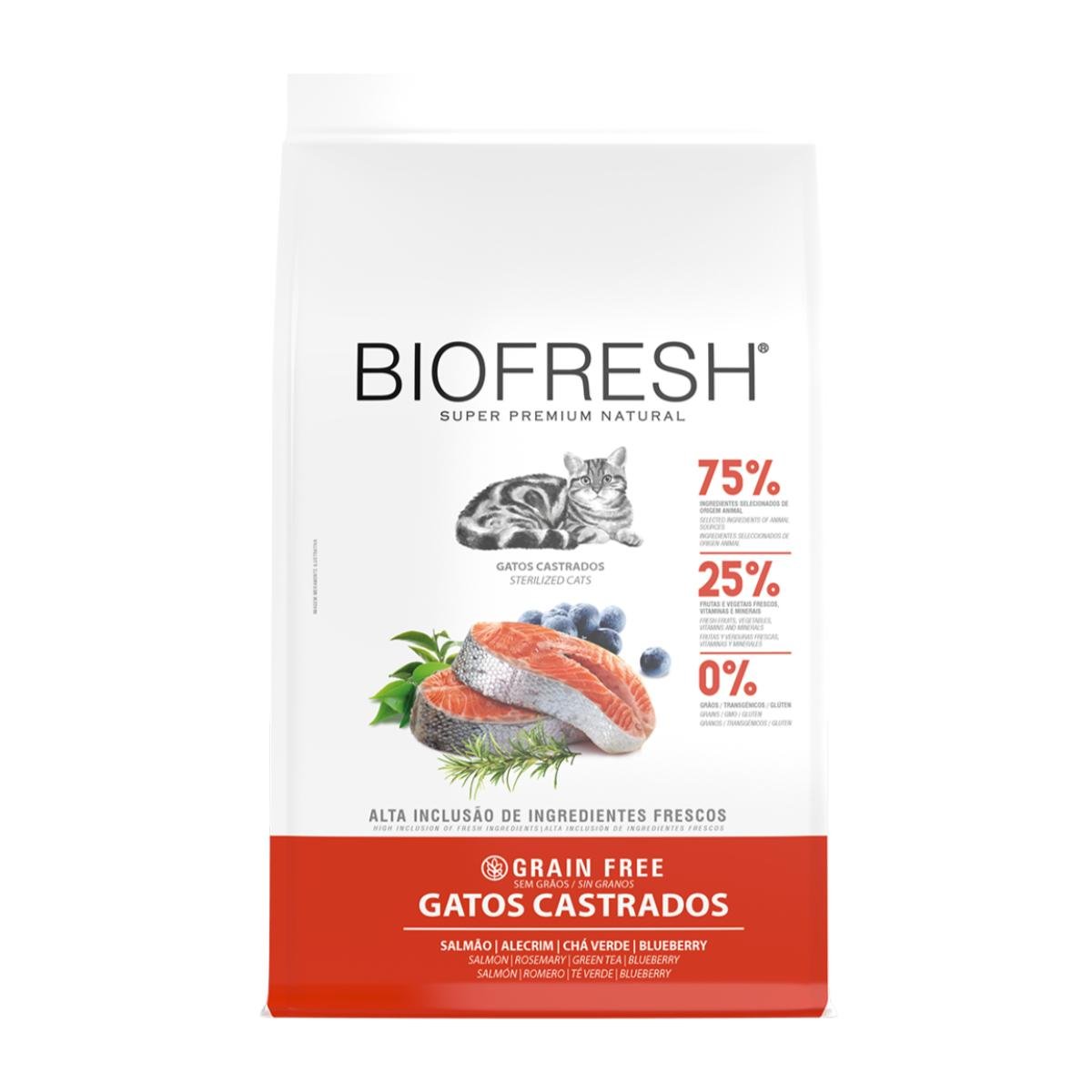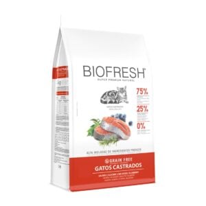 Selección de carnes frescas (carne de pescado, carne de salmón separada mecánicamente, carne de pollo (pechuga), hígado de ave y carne de pollo separada mecánicamente) (mín. 20%), selección de frutas frescas, verduras y hierbas (manzana, zanahoria, remolacha y orégano) (mín. 2%), aceite de pescado (fuentes naturales de EPA y DHA), harina de corteza de cerdo, harina de subproductos avícolas y aceite de ave (conservado naturalmente con tocoferoles), huevo en polvo, extracto de arándano, extracto de yuca y extracto de té verde, harina de yuca, pulpa de remolacha deshidratada, celulosa en polvo, hígado de ave y cerdo hidrolizado, guisantes deshidratados, levadura de cerveza inactivada deshidratada, pared celular de levadura (fuente de manano oligosacáridos), inulina (mín. 0,02%), hexametafosfato de sodio, L-carnitina, taurina, DL-metionina, L-lisina, cloruro de potasio, cloruro de sodio (sal común), cloruro de colina, ácido fosfórico, vitaminas (A, B1, B2, B6, B12, C, D3, E, K3, ácido fólico, ácido pantoténico, biotina y niacina) y minerales quelados con aminoácidos (cobre, hierro, manganeso, zinc y selenio), yodato de calcio y antioxidantes naturales (tocoferoles, extracto de romero y ácido cítrico).
