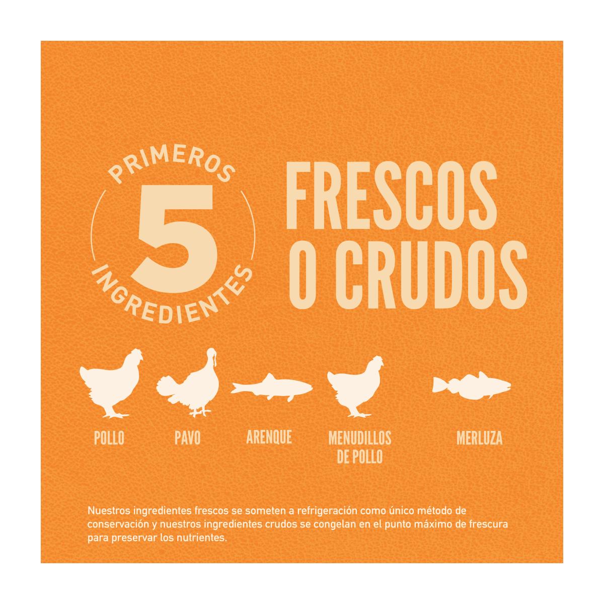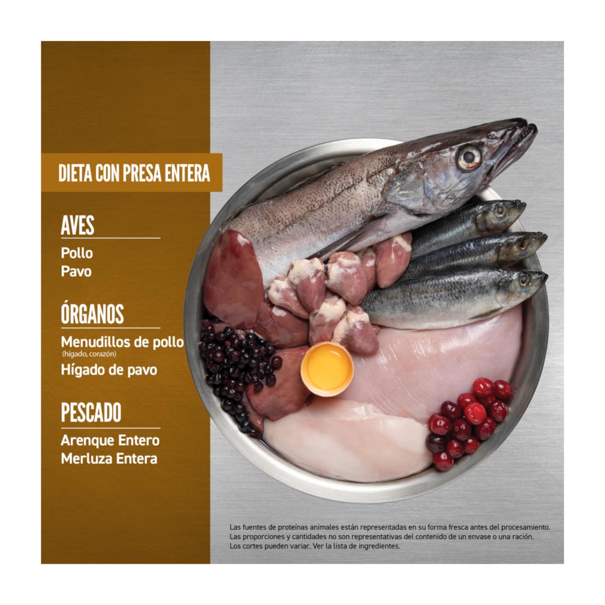 Pollo, pavo, arenque entero, menudillos de pavo (hígado, corazón, molleja), salmón, pollo deshidratado, pavo deshidratado, salmón deshidratado, hígado de pollo deshidratado, huevo deshidratado, lentejas rojas enteras, frijoles pintos enteros, lentejas verdes enteras, hígado de pollo, huevos, grasa de pollo, sabor natural a pollo, frijoles blancos enteros, garbanzos enteros, guisantes enteros, aceite de abadejo, fibra de lentejas, corazones de pollo, cloruro de colina, arándanos enteros, algas secas, tocoferoles mixtos (conservante), suplemento de vitamina E, proteinato de zinc, calabaza entera, calabaza moscada entera, berza, manzanas enteras, peras enteras, mononitrato de tiamina, proteinato de cobre, niacina, clorhidrato de piridoxina, producto de fermentación de Bacillus coagulans seco, raíz de achicoria seca, cúrcuma, raíz de zarzaparrilla, raíz de althea, escaramujos, bayas de enebro, ácido cítrico (conservante), extracto de romero.