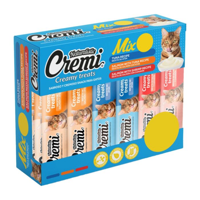 Cremi Seafood Recipe Mix es un paquete con tubos de snack cremoso para gatos, en un surtido de sabores de mar: Atún, Salmón/Atún y Salmón/Camarón. Elaborado con carne de atún, salmón y camarón, este snack está reforzado con taurina y tiene un alto porcentaje de humedad (máx. 83%) para favorecer la hidratación con solo 6.9 kcal por tubo.