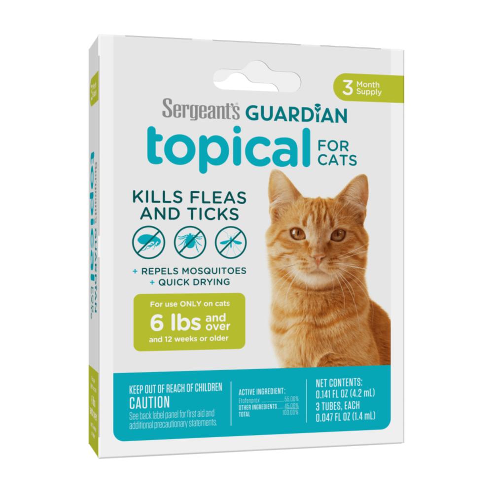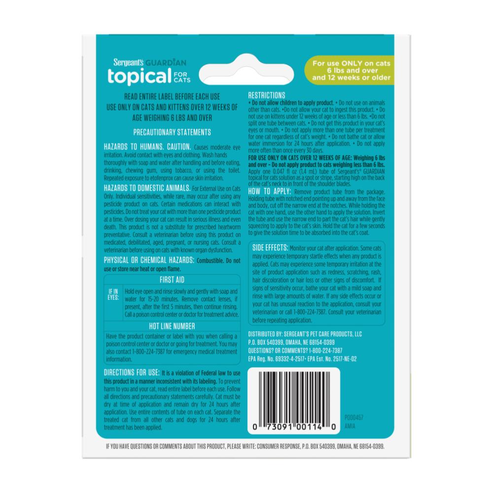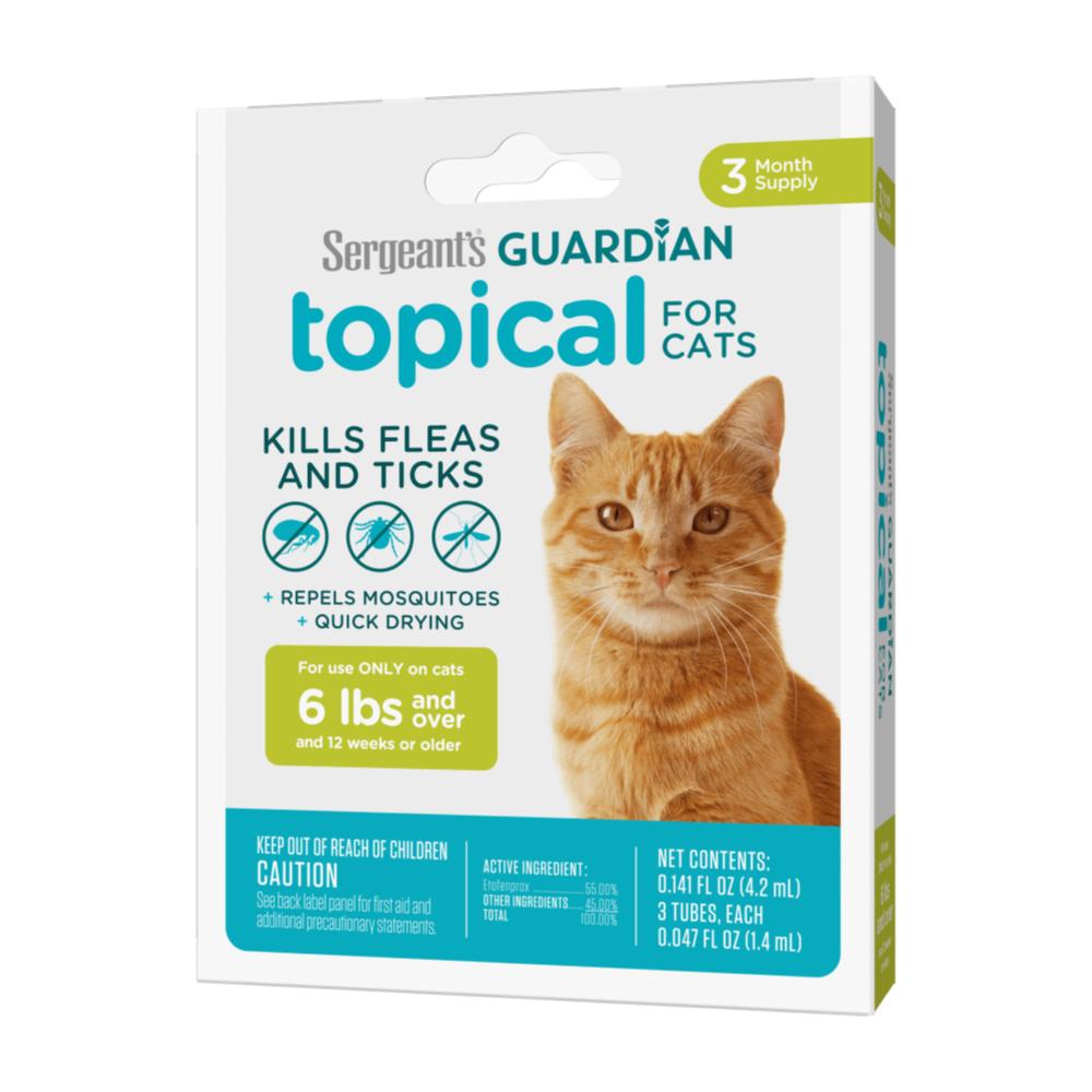 Sergeant’s Guardian es una pipeta tópica de alta eficacia diseñada para proteger a tu gato de pulgas, garrapatas y mosquitos hasta por 30 días con cada aplicación. Este producto de secado rápido y resistente al agua ofrece un control parasitario preventivo y curativo. Utiliza Etofenprox como ingrediente activo, que ataca el sistema nervioso de los parásitos por contacto, asegurando que no necesiten picar a tu gato para morir. El paquete proporciona un suministro completo para 3 meses (3 pipetas). Apto para gatos de 12 semanas de edad o mayores y según el rango de peso.
