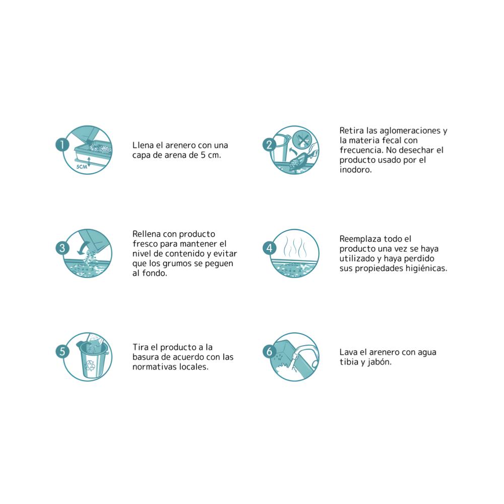 Llena el arenero con una capa de 4 cm de arena. Retira diariamente los aglomerados y excrementos. Añade más arena para mantener el nivel y reemplaza completamente el contenido una vez al mes.