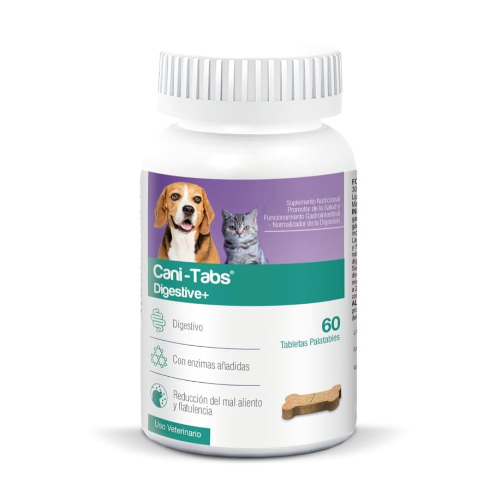 Cani-Tabs Digestive+ es una solución suplementaria formulada para favorecer el confort gastrointestinal y hepático en perros y gatos, logrando un alivio rápido de la pesadez, flatulencias y náuseas gracias a su complejo enzimático suave y extractos botánicos naturales.