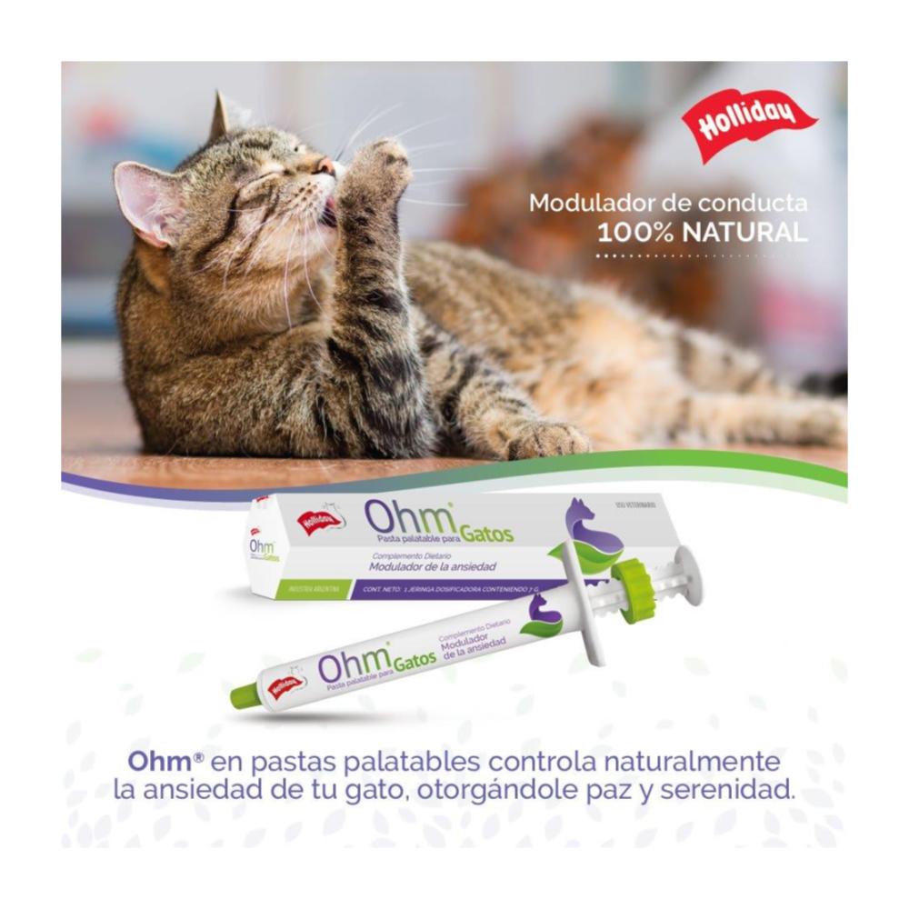Holliday OHM Pasta para Gatos es un modulador de ansiedad para gatos en pasta altamente palatable, diseñado como coadyuvante en el manejo de la ansiedad y el estrés felino. Su innovadora fórmula incluye Triptófano, Valeriana y Teanina para modular la conducta de forma natural. La presentación en jeringa dosificadora facilita su administración, y el sabor a Aceite de Hígado de Bacalao lo hace muy atractivo para los gatos.