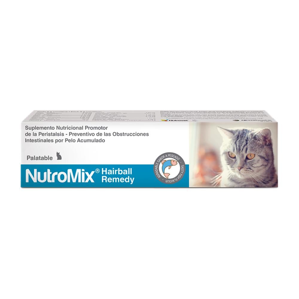 NutroMix Hairball Remedy es un suplemento en gel formulado para favorecer el tránsito digestivo y el cuidado capilar en gatos, logrando la eliminación de las bolas de pelo y un confort gástrico total gracias a su efecto lubricante natural y su alto aporte de Omega 3.