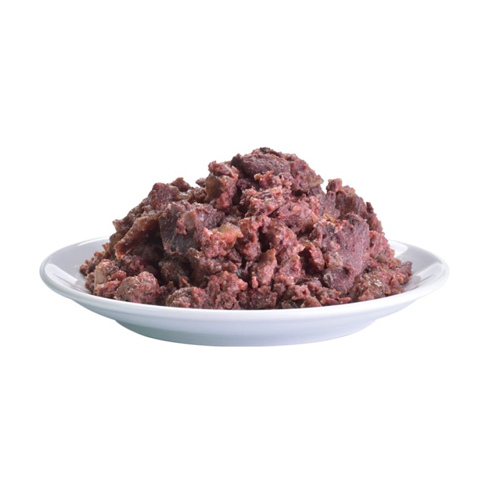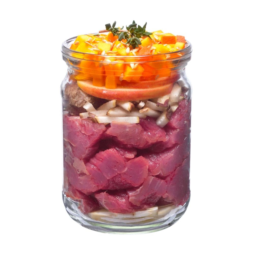 68% de carne de vaca, 13% de caldo, 10.8% de calabaza, 2% de manzana, 2% de minerales, 1% de mezcla de hierbas (romero, tomillo, caléndula, diente de león), 1% de perejil, 1% de aceite de salmón, 0.5% de alcachofa de Jerusalén, 0.5% de linaza, 0.2% de algas