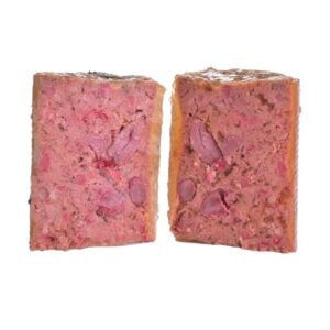 La elección se basa en la calidad de sus proteínas y grasas funcionales. El Salmón es una fuente excelente de Omega 3 (ácidos grasos insaturados), esenciales para el desarrollo cognitivo y la salud de la piel/pelo. El Pavo complementa con proteínas altamente digestibles y micronutrientes como el Zinc y las Vitaminas B3 y B6, vitales para la función cerebral y muscular. La inclusión de Arándanos y Frambuesas añade antioxidantes naturales. Con un 67% de carne y una energía metabolizable de 1080 kcal/kg, es un paté altamente nutritivo y delicioso.