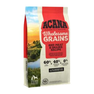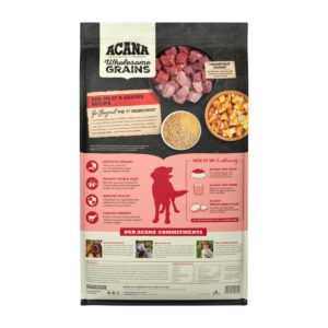 ACANA™ Whole Grain Red Meat + Grain es un alimento seco elaborado con carnes rojas ricas en proteínas y granos saludables. Además, combina ingredientes animales con prebióticos y probióticos para apoyar la digestión. Por eso, ofrece una nutrición equilibrada para perros de todas las razas.