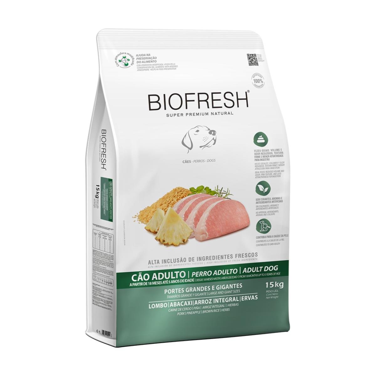 Elegir Biofresh Cerdo y Piña es garantizar una nutrición funcional que aborda las necesidades específicas de las razas grandes, ya que su proteína de cerdo, alta en triptófano y glutamina, se combina con niveles superiores de Glucosamina y Condroitina para la máxima protección articular; además, su inclusión de piña y probióticos mejora la digestión de manera única, ofreciendo un alimento de alta palatabilidad, bajo en alérgenos comunes y con soporte integral para el peso y la salud oral con 3.900 kcal/kg de energía metabolizable.