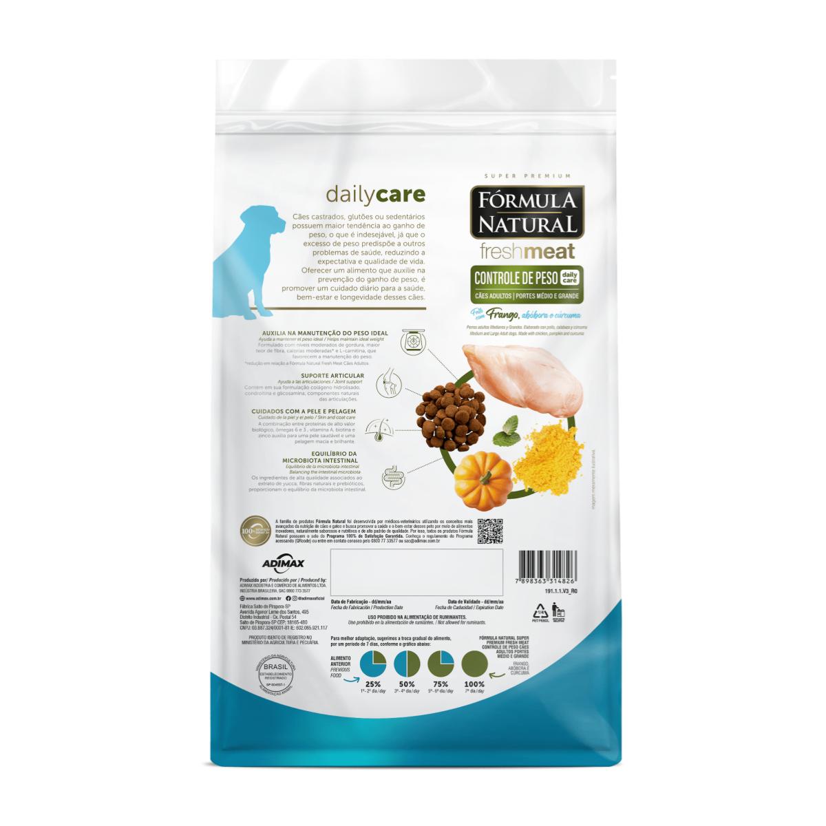 Fórmula Natural Control Peso para Adultos de Raza mediana y grande es un alimento seco de la Línea Súper Premium formulado para ayudar a mantener un peso ideal en perros adultos de tamaño mini y pequeño propensos al sobrepeso (castrados, glotones o sedentarios). Esta fórmula se distingue por su equilibrio: alta proteína (30%) para mantener la masa muscular y baja grasa (12%) con un alto nivel de fibra (4.5%) para promover la saciedad y la regularidad intestinal. Está elaborado con Carne Fresca de Pollo (mín. 16%) e incluye L-Carnitina para el metabolismo de las grasas.