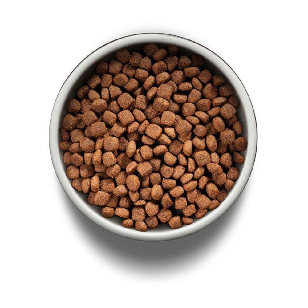 Contiene una selección de ingredientes de origen animal (mín. 65%), que incluyen carne y hígado de pollo separados mecánicamente, harina de subproductos avícolas, y aceite de pescado refinado.