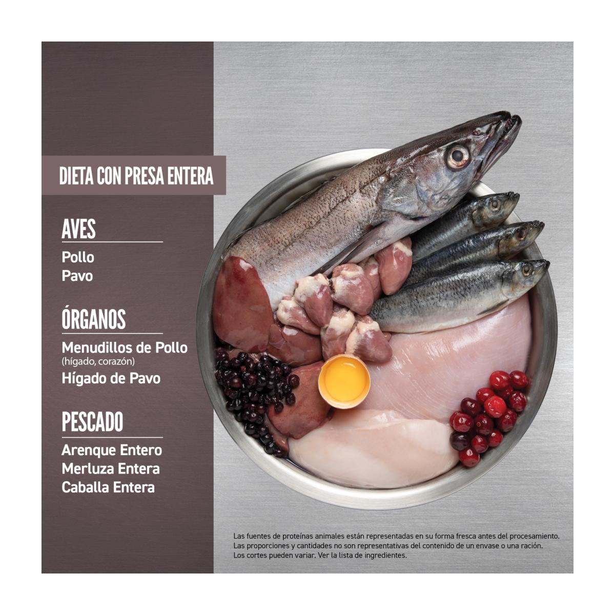 Ingredientes naturales y enteros: La dieta de presa entera (WholePrey™) utiliza órganos y huesos para una nutrición completa y equilibrada.