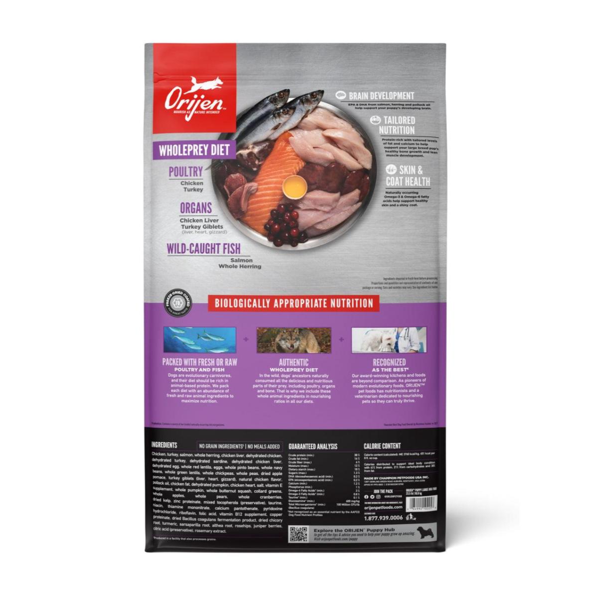 Todos los cachorros de razas grandes se desarrollan mejor con una dieta Biologically Appropriate™ (Biológicamente Apropiada) rica en proteínas y grasa de ingredientes de origen animal de calidad. ORIJEN™ Puppy Large Breed contiene un 85% de ingredientes de origen animal de calidad como pollo y pavo frescos o crudos, pescado y huevos. Rico en ingredientes de origen animal de presa entera,™ ORIJEN™ Puppy Large Breed está elaborado con las partes suculentas y nutritivas de la presa, para proporcionar la nutrición que los cachorros necesitan. El resultado es una dieta para tu perro que no tiene comparación.