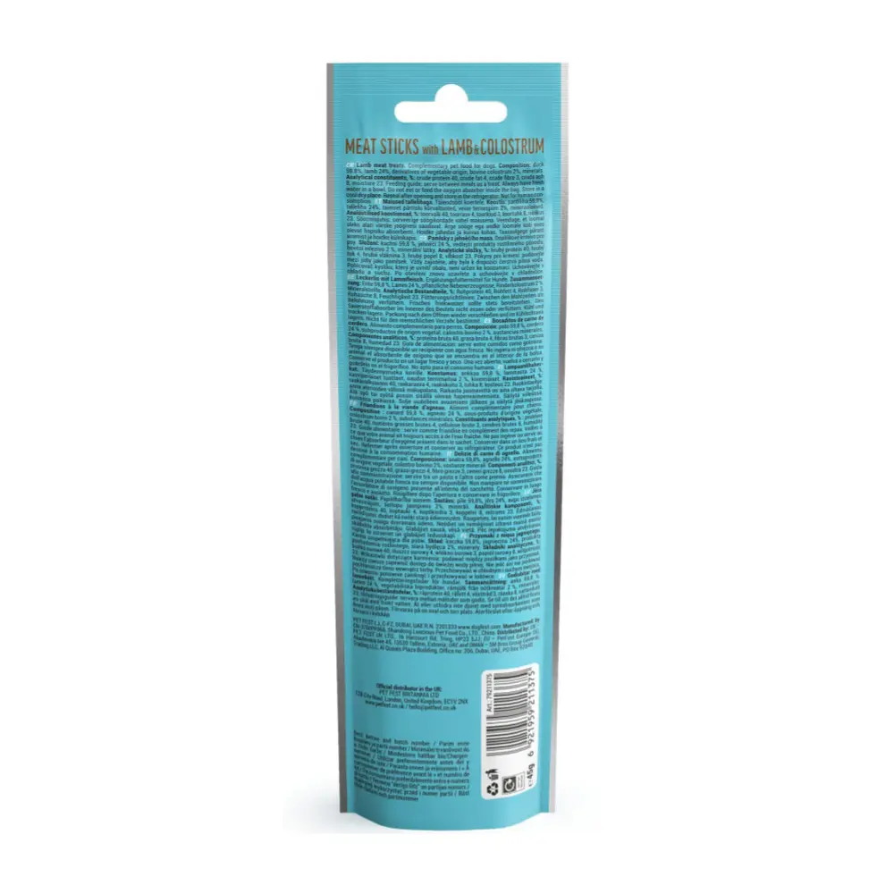 Dog Fest Meat Sticks With Lamb Con Calostro 45gr es un snack funcional indicado para tratar el sistema inmunológico en desarrollo en cachorros, logrando un crecimiento saludable y defensas naturales reforzadas gracias a la inclusión de calostro bovino rico en vitaminas esenciales.