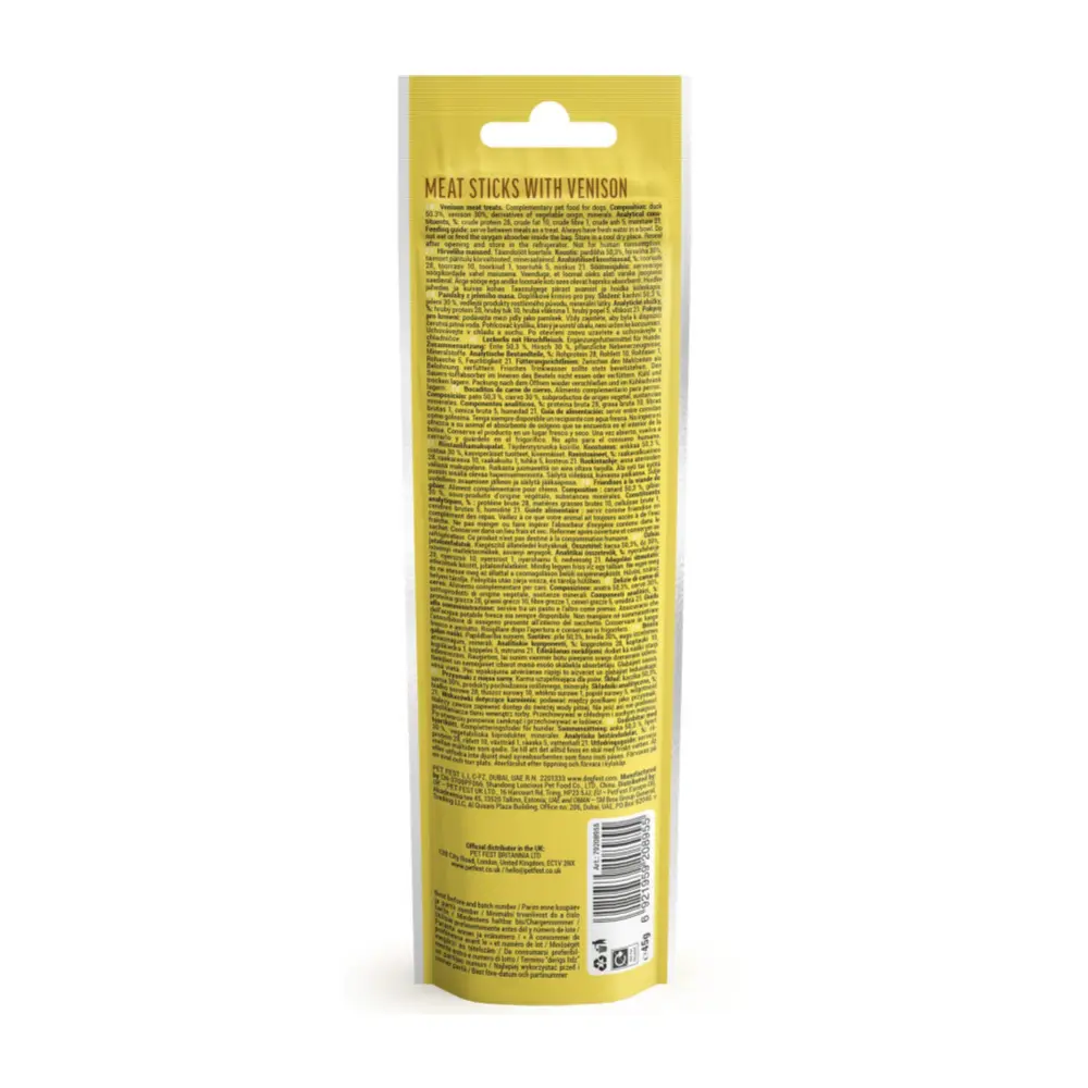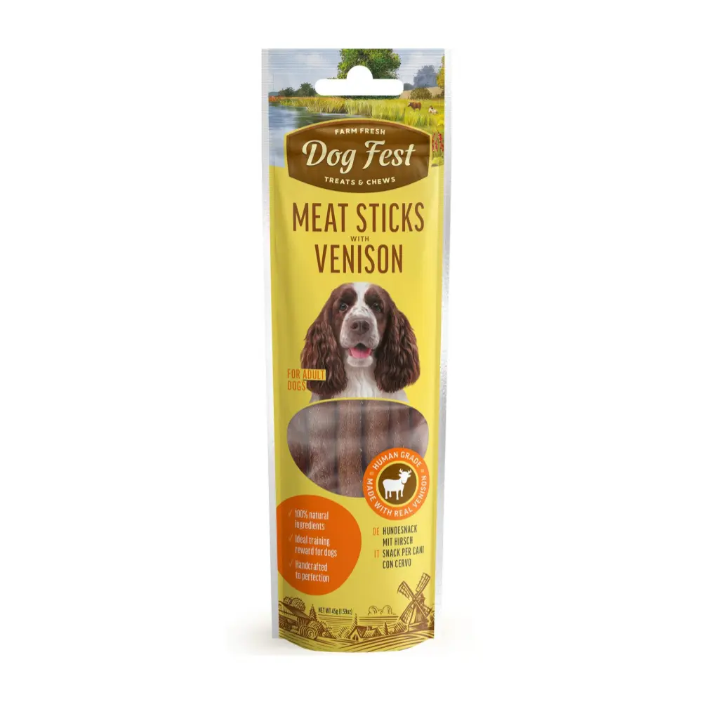 Dog Fest Meat Sticks With Venison 45gr es un snack premium indicado para tratar la falta de atención y desmotivación en perros de todas las razas, logrando un enfoque total durante el adiestramiento gracias a su irresistible aroma silvestre y el uso de carnes exóticas como el venado y el pato.