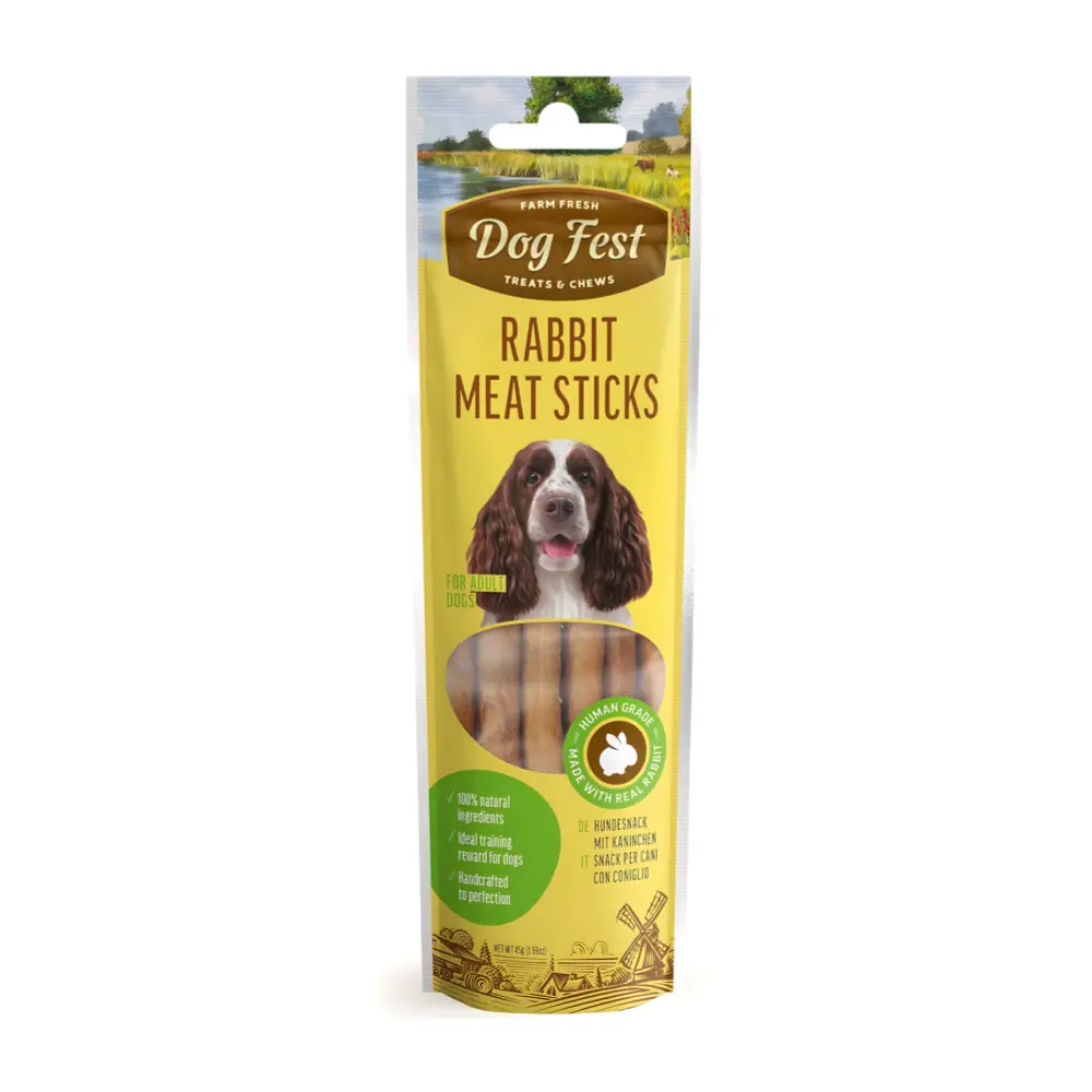 Dog Fest Rabbit Meat Sticks 45gr es un snack de alta palatabilidad indicado para tratar la falta de motivación durante el entrenamiento en perros, logrando una recompensa saludable y efectiva gracias a su carne de conejo tierna y su sabor 100% natural.