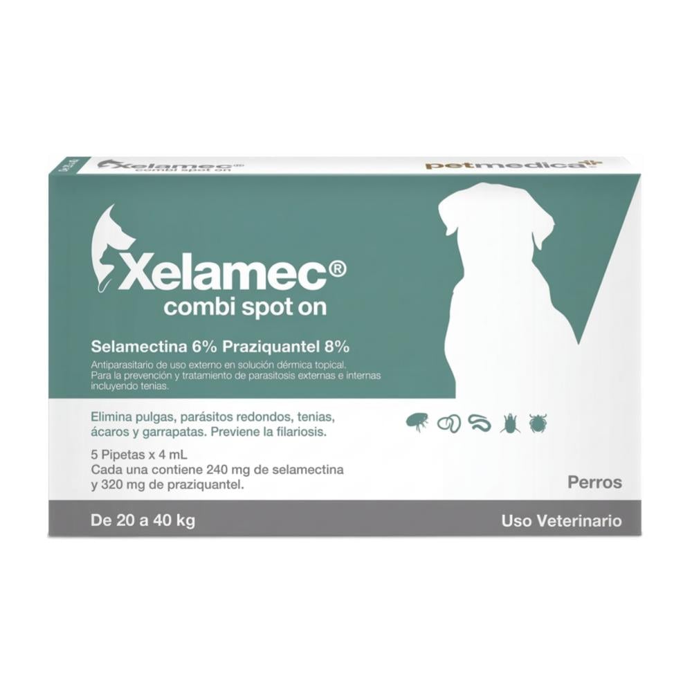 Xelamec Combi Spot On 20 a 40kg es una solución antipulgas y antiparasitaria formulada para favorecer la protección integral en perros, logrando un control completo de parásitos internos y externos gracias a su acción sistémica de amplio espectro.