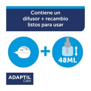 ADAPTIL Difusor + Repuesto es el difusor de feromonas para perros ideal para crear un ambiente seguro y tranquilo en casa. Al liberar continuamente el análogo de la Feromona del Apaciguamiento Canino en el ambiente, ayuda a tu perro a sentirse más calmado y a gestionar situaciones que le generan estrés, miedo o ansiedad. Es una solución no farmacológica respaldada por veterinarios.