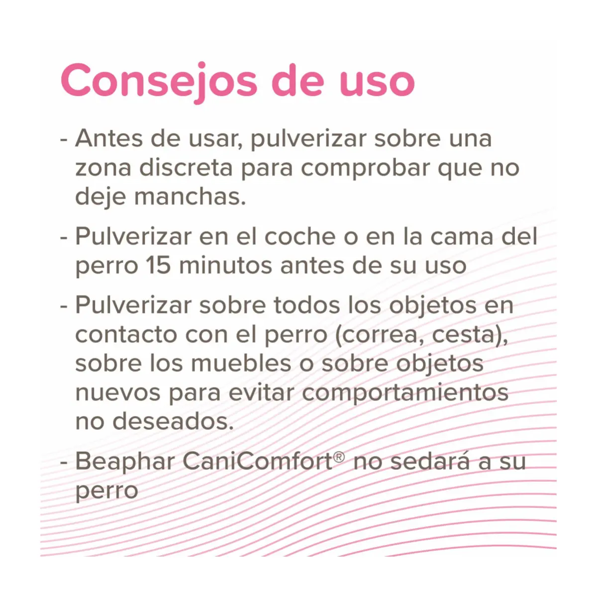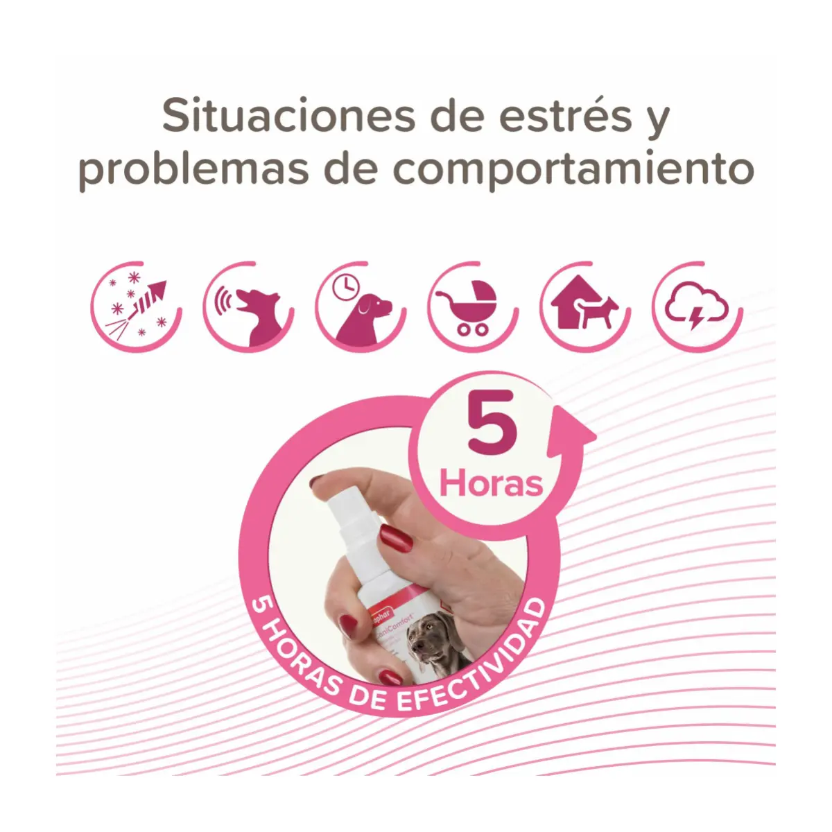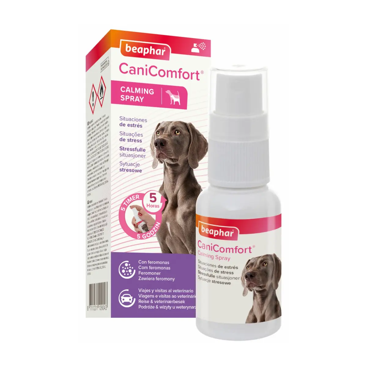 Beaphar CaniComfort Calming Spray 60ml es un reductor de estrés con feromonas indicado para tratar la ansiedad por viajes y problemas de comportamiento en perros, logrando un estado de tranquilidad profunda y seguridad gracias a su copia sintética de la feromona de apaciguamiento canino (DAP).
