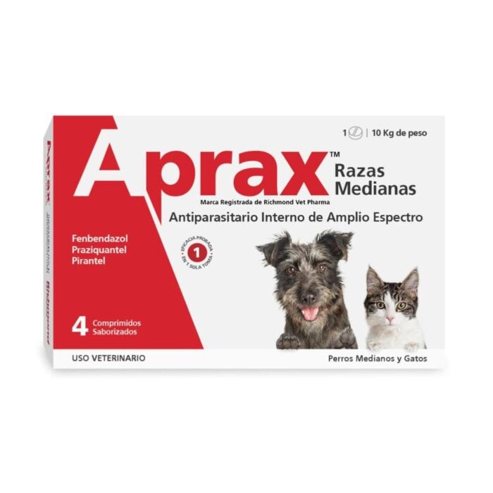Producto antiparasitario para perros y gatos. En resumen, Aprax Comprimidos Razas Medianas x4 ofrece una solución eficaz y segura para el control de parásitos intestinales; aun así, se recomienda seguir la dosificación indicada y consultar al Médico Veterinario ante cualquier duda.