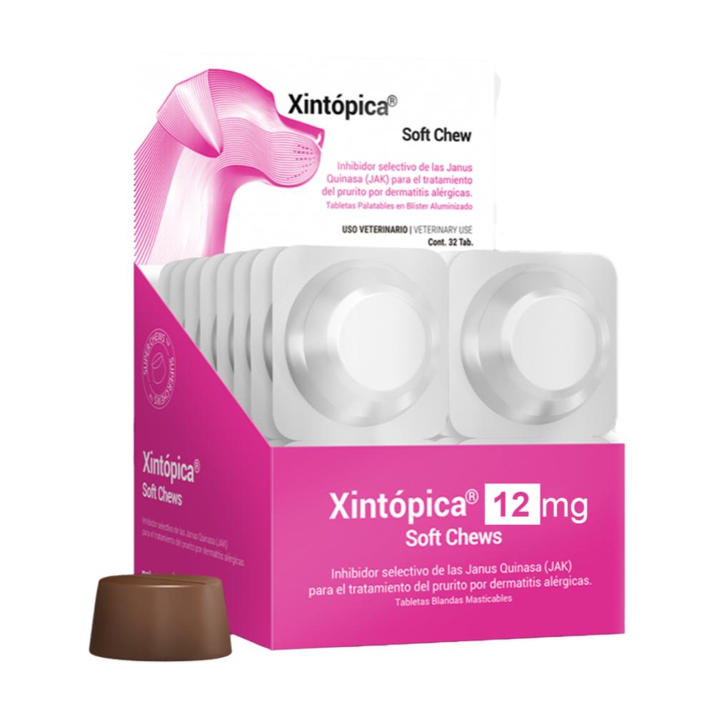 Xintópica® 12 mg es un medicamento de uso veterinario en forma de tabletas blandas masticables, altamente palatables, diseñado para el tratamiento y control del prurito (picazón) asociado con la dermatitis alérgica y la dermatitis atópica en perros. Actúa como un antiprurítico e inmunomodulador.