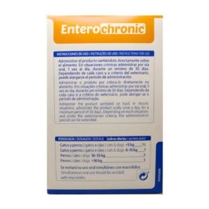 Entero-Chronic es un alimento complementario para perros y gatos que ayuda a restaurar y mantener la salud intestinal. Su fórmula única, que contiene α-Glucano Butirogénico, MPS Protect, β-glucanos y MOS, actúa de forma integral: produce butirato para reparar la mucosa, refuerza las defensas naturales y equilibra la flora bacteriana para combatir la inflamación y las infecciones. Indicado para alteraciones intestinales crónicas como IBD, diarreas por antibióticos, alergias alimentarias y otras disfunciones gastrointestinales, este producto de alta palatabilidad puede administrarse por vía oral durante periodos prolongados sin efectos adversos.