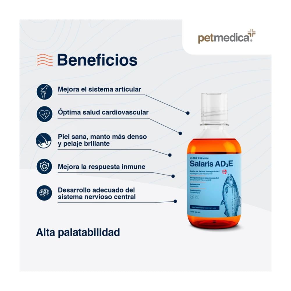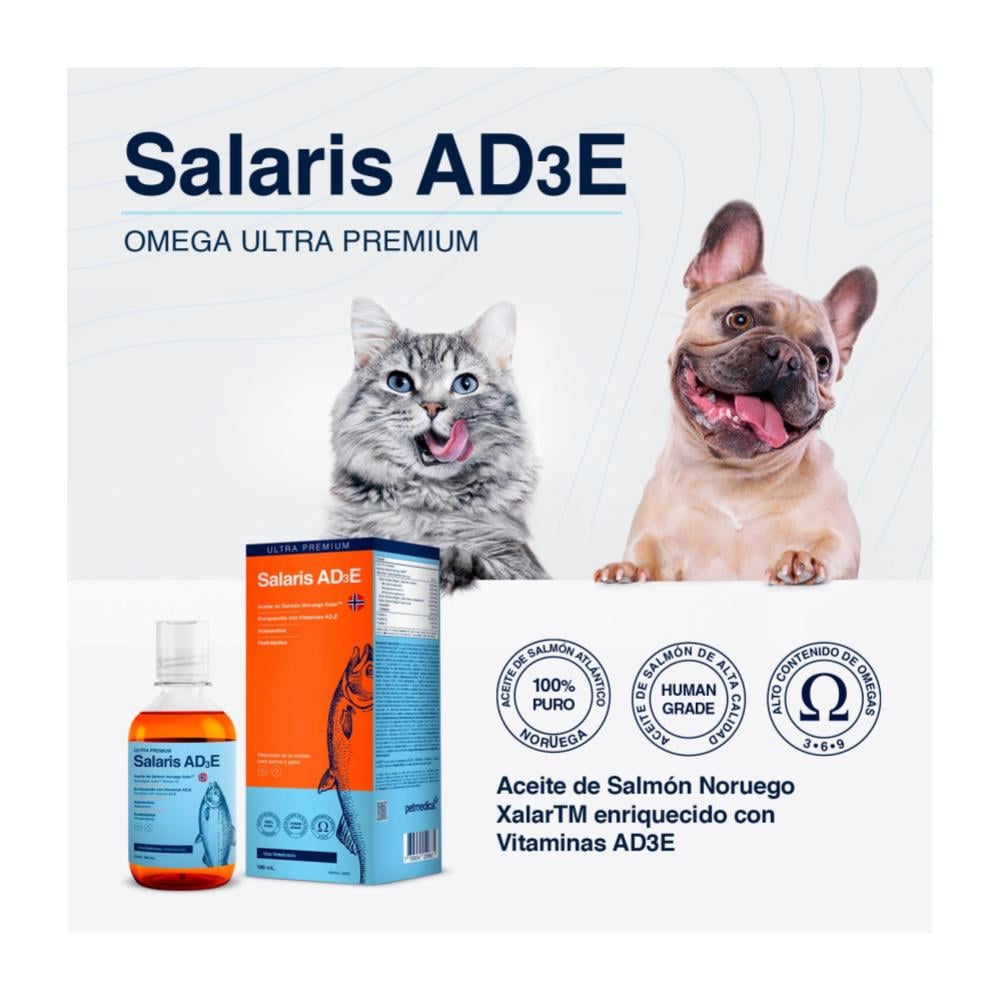 Salaris AD3E es un suplemento líquido ultra premium formulado para transformar la salud integral de tu perro o gato, logrando un pelaje deslumbrante y una vitalidad renovada gracias a la pureza de su aceite de salmón noruego enriquecido con vitaminas y potentes antioxidantes.